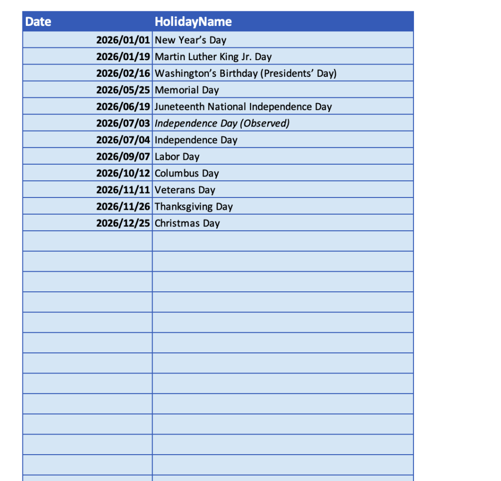 Enter holiday dates in YYYY/MM/DD format.